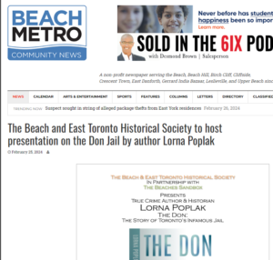 The Beach and East Toronto Historical Society will host a presentation by true crime author and historian Lorna Poplak later this month.