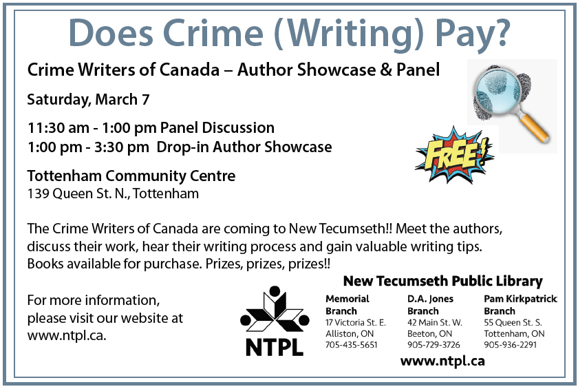 Kim Burgess,  New Tecumseth Public Library  Adult Services Programmer moderated this group of crime writers sharing stories of murder, bank heists, mystery, and intrigue.